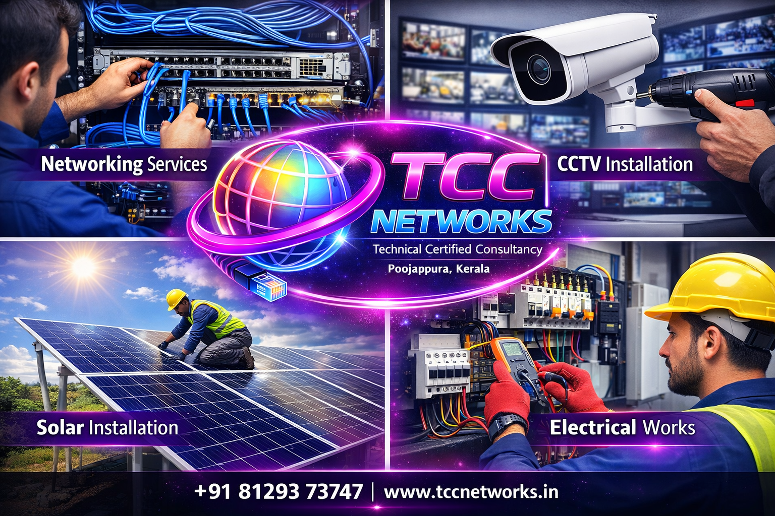 TCC Networks is a trusted name in delivering advanced technology solutions and reliable electrical services. Based in Poojappura, we specialize in providing end-to-end solutions in networking, CCTV surveillance, solar installations, and electrical works for residential, commercial, and industrial clients. With a strong commitment to quality and innovation, we ensure every project is executed with precision and professionalism. Our team is equipped with industry expertise and modern tools, including advanced testing equipment like Fluke instruments, to guarantee accuracy, safety, and long-lasting performance.